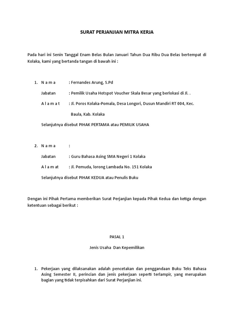 Misalnya janji untuk pergi kerja bersama atau janji untuk nonton bola pada malam hari bahkan berjanji untuk setia dengan pasangan. Dalam setiap contoh tersebut, surat surat perjanjian memiliki sifat mengikat semua pihak yang terlibat di dalamnya. Contoh surat perjanjian kerjasama usaha yang baik harus memenuhi sejumlah syarat tertentu. Bertindak selaku atas nama dari pt…………, selanjutnya dalam perjanjian ini disebut pihak pertama. Berikut ini dibagikan beberapa contoh surat perjanjian yang biasanya digunakan dan kemudian setelahnya anda bisa melihat beberapa tips berguna yang bisa di simak sebagai referensi pembuatannya. Dengan menggunakan aplikasi karyaone, anda bisa membuat database karyawan dengan lengkap sesuai dengan surat perjanjian kerja. Berikut adalah contoh surat perjanjian kerjasama bagi hasil proyeke bisnis antara dua pihak yang bersepakat untuk mendirikan sebuah restoran di daerah bogor. Melalui kontrak terciptalah perikatan atau hubungan hukum yang menimbulkan. Dengan adanya contoh, maka anda bisa membuatnya dengan lebih mudah karena hanya tinggal meniru dan mengubah sesuai kebutuhan anda. Contoh penulisan surat kesedian kerja sama mitra ukm by dayangprobo. Contoh surat perjanjian kerjasama di berbagai bidang. Melihat dari manfaat dan isi surat perjanjian kerja sama usaha di atas, kita tentu sudah dapat menggambarkan poin apa saja yang harus dimasukkan dalam surat perjanjian kerjsa sama usaha. Selain itu, dibuat menggunakan format yang baik dan benar.
